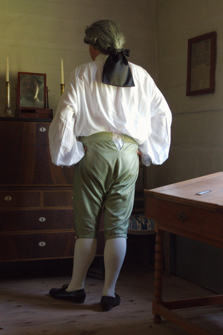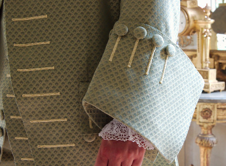 The sleeve cuff is also modeled after Waugh, and I also cut it out on old sheet to see how it would look. It may be slightly smaller than in the V&A suit, but looks balanced. With this type of large cuff the sleeve also had to shortened a bit to show off the lace cuffs and also not to look too heavy.