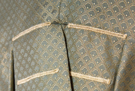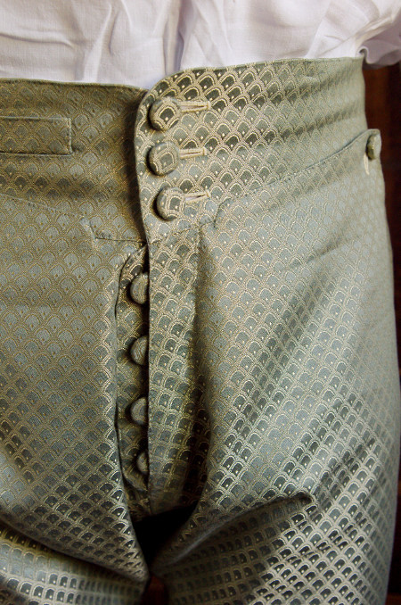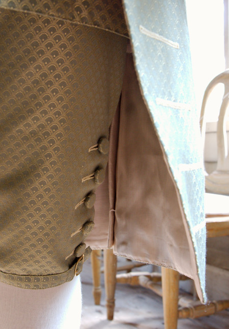 As usual, when finishing something you have worked on for a while, at first I was simply happy that I didn't have to see it on my sewing table anymore, but it usually also happens that when you look at the pictures of the finished garment you begin to feel proud and happy. The mistakes are there, of course, like the problems with the shoulder seam and sleevehead, and especially the front edges of the coat which don't fall quite straight due to the interlining which had stretched on the edge when I sewed on the straight cut reinforcement strip which was supposed to prevent that very thing. This is a good remainder to do all the stages carefully. Anyway, I can live with that. Another thing that began to bother me a little on the finished suit is that I originally thought that the buttons for the coat and waistcoat could as well be the same size (the buttons on the waistcoat tended to be smaller in period suits), but now I think that doesn't look quite right. But the things I still love are the material and the style and cut of the suit.