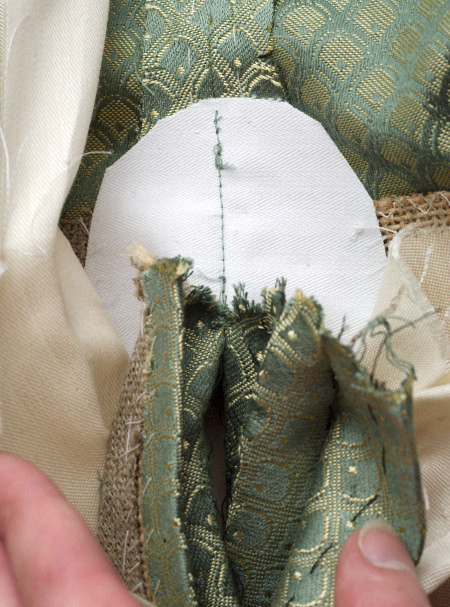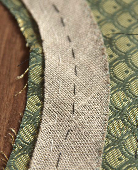 After tacking the interlining on the back skirts I joined the back vent pieces, pressed the seams and tacked the seam allowances on the interlinings. I also reinforced the tight corner at the waist with some stitching and then tacked a 3cm wide jute piece on the waist from the center back to the side seam. Then I made the last decorative buttonholes to cover the seam at the waist. Neck opening at the back also got a piece of jute, and to strengthen the center back and side seams I basted cotton tapes on both sides of the seam. I thought these necessary to support the heavy skirts, especially at the center back seam which was cut quite angled.