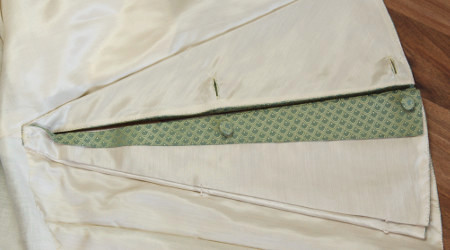 On the back I first attached the lining in the back vent pieces. Then I moved on to the rest of the skirts, beginning at the center back. I pinned the lining on the folds one by one, first pressing the fold and then tacking the lining to the interlining with herringbone stitches. At last I arrived at the side vent, where I stitched the edge leaving the top unfinished like in the front.